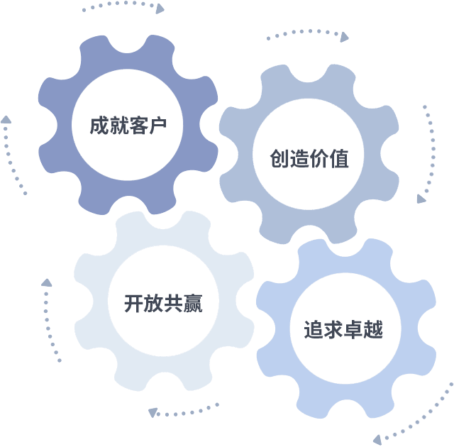成就客户是一切决策的出发点,,,,创造价值是衡量所有工作的标准,,,,追求卓越是我们做事做人的态度,,,开放共赢是我们的格局也是最终的结果。。。。价值观的齿轮环环相扣,,,推动着组织里的每个人不断向前。。
